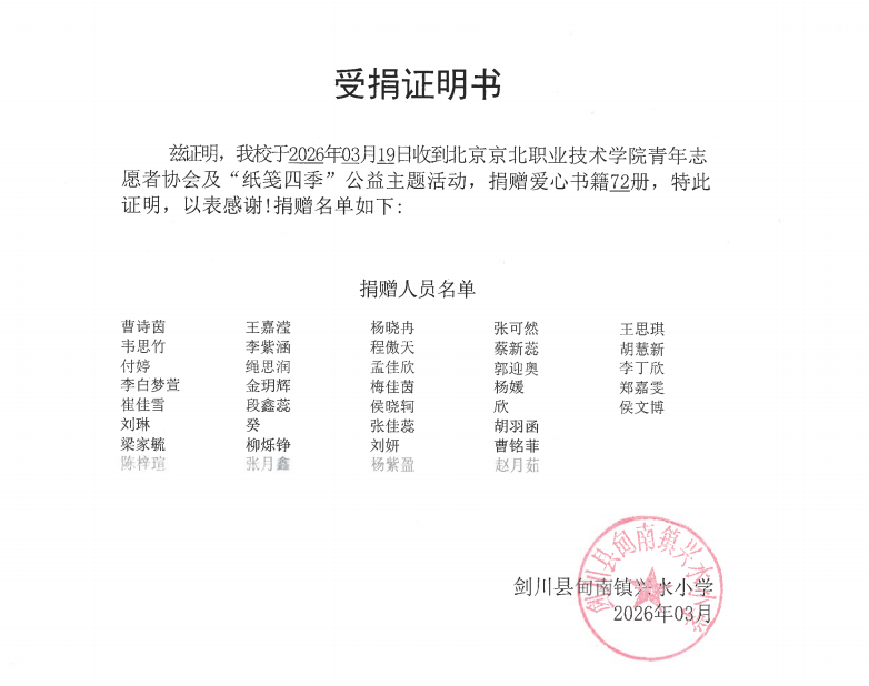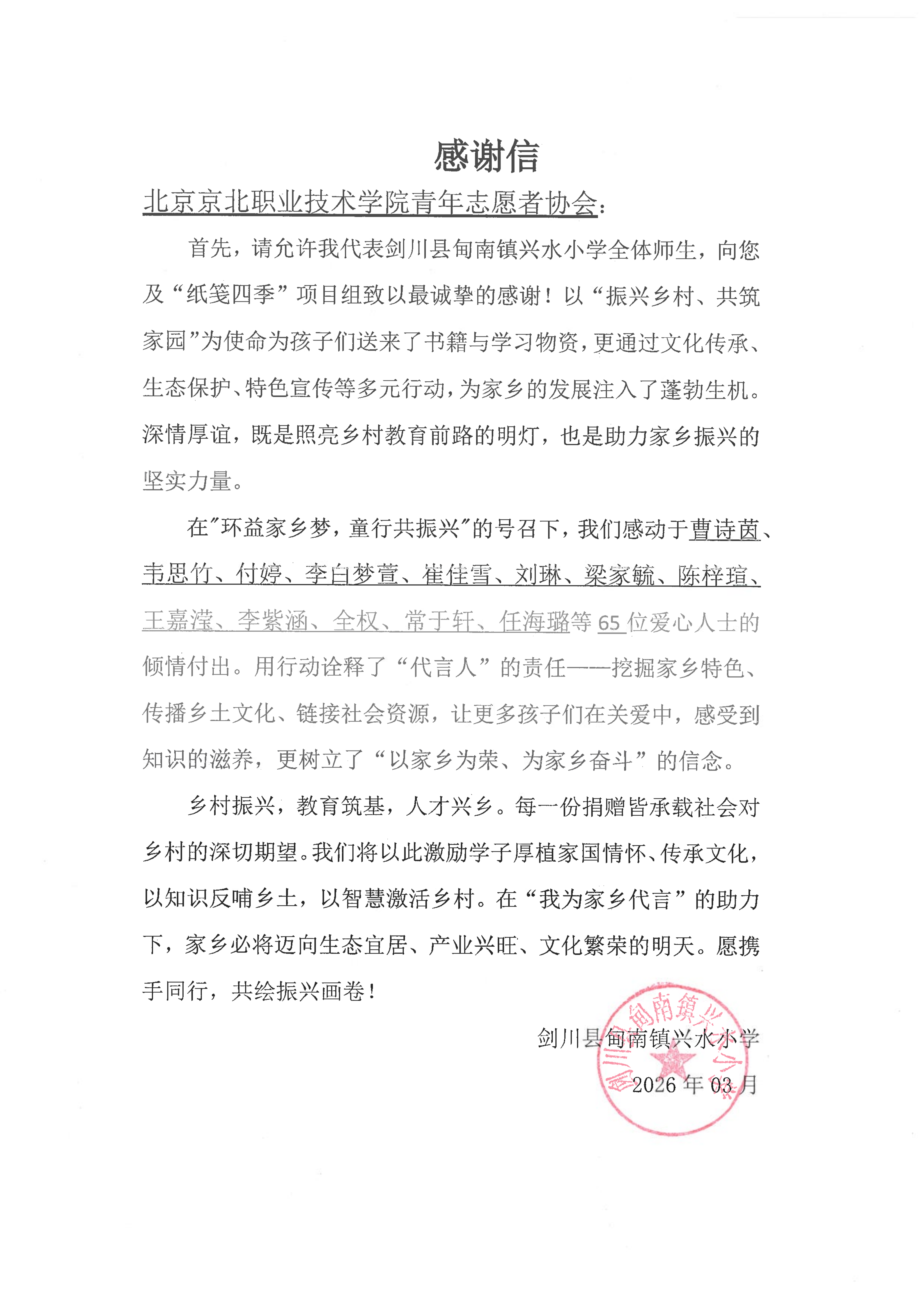 近日,京北职院青年志愿者协会收到来自云南省剑川县甸南镇兴水小学的感谢信和受捐证明,对学院“纸笺四季”公益主题活动捐赠爱心书籍72册表示感谢。