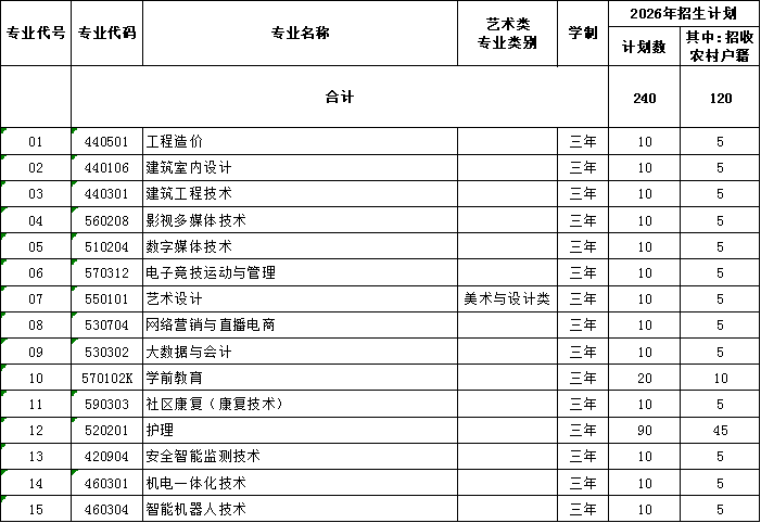 考生可填报三个专业志愿并选择是否服从调剂。以志愿优先为原则,根据城镇和农村户籍招生计划分别按总评成绩从高到低择优录取。总评成绩相同,依次比较职业测评、加分成绩择优。职业测评成绩低于120分者不予录取。