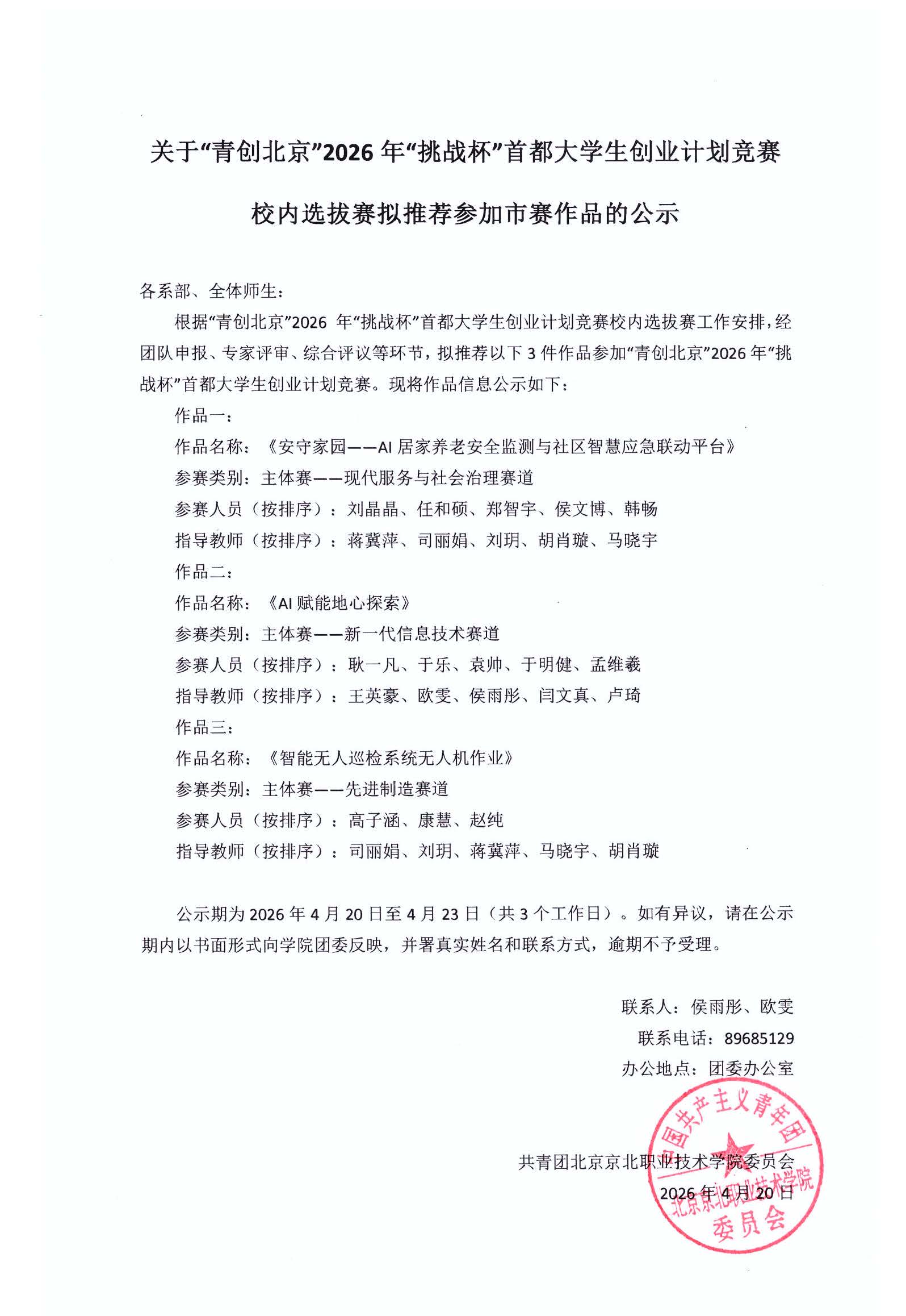 关于“青创北京”2026年“挑战杯”首都大学生创业计划竞赛校内选拔赛拟推荐参加市赛作品的公示